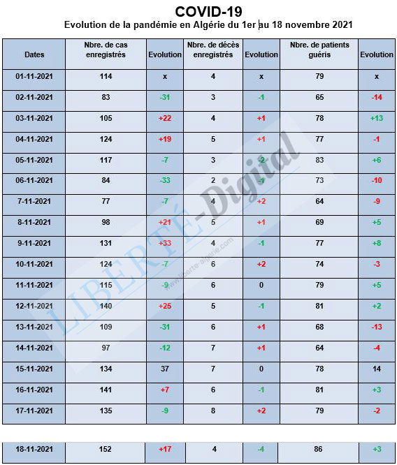 Évolution de la pandémie en Algérie du 1er au 18 novembre 2021