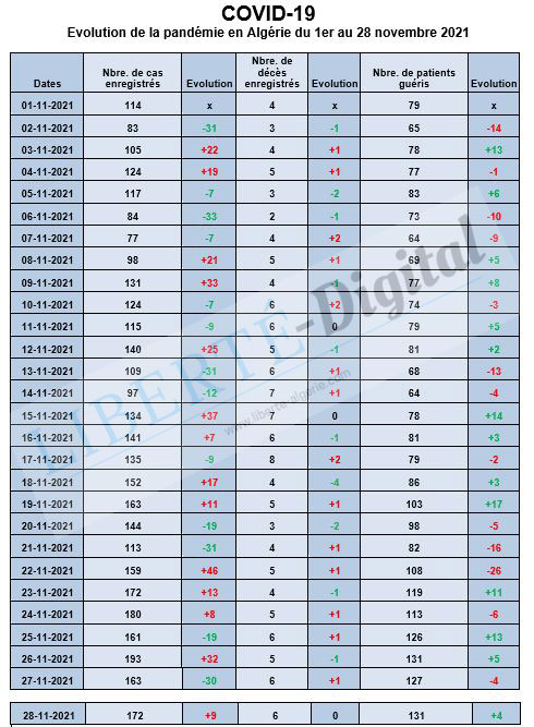 Évolution de la pandémie en Algérie du 1er au 28 novembre 2021