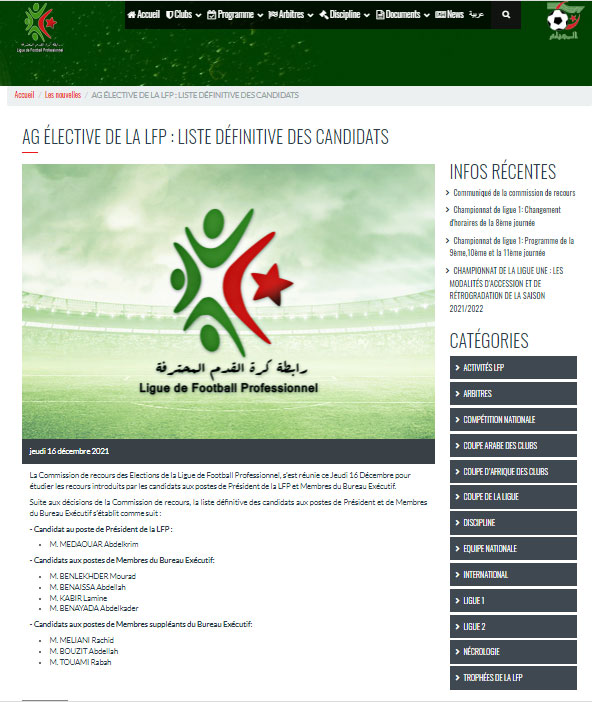 Membres du Bureau exécutif est la suivante : Abdelkrim Medouar, candidat au poste de président, alors que les candidats de membres du Bureau exécutif sont : Benlakhder Mourad (JS Saoura), Benaïssa Abdallah (US Biskra), Kebir Lamine (représentant des entraîneurs), et Benayada Abdelkader (représentant des joueurs)"